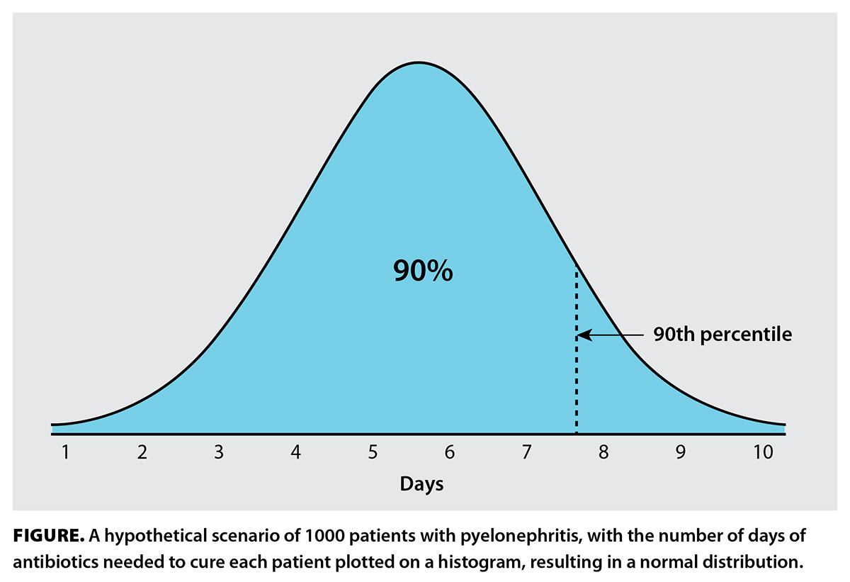 Clinicians tend to favor certain treatment durations, particularly 5, 7, 10, and 14 days.[17] These fixed durations are inadequate, as they are not individualized. Consider this hypothetical scenario: There are 1000 patients with pyelonephritis, and you know exactly how many days of antibiotics are needed to cure each patient. You plot these numbers on a histogram, ending up with a normal distribution [Figure]. You are tasked with writing a recommendation on treatment duration in a guideline. Should you recommend 6 days (median)? That won’t work, because only half of the patients will be cured. How about 8 days, so that at least 90% are expected to be cured? Unfortunately, 8 days results in overtreatment of most patients, who require 7 or fewer days. How about a range, such as 1 to 10 days? This would seem to be the most correct answer, but it fails if the clinician is unable to determine the precise number of days required for their patient. To combat this problem, biomarkers such as C-reactive protein and procalcitonin can be used to guide antibiotic duration, but these tools have limited predictive power of when the infection will have cleared.[18] Additionally, validated clinical criteria can also be used to determine the length of therapy.[19] Treatment guided by biomarkers and clinical criteria are a step in the right direction toward personalized antibiotic durations.
