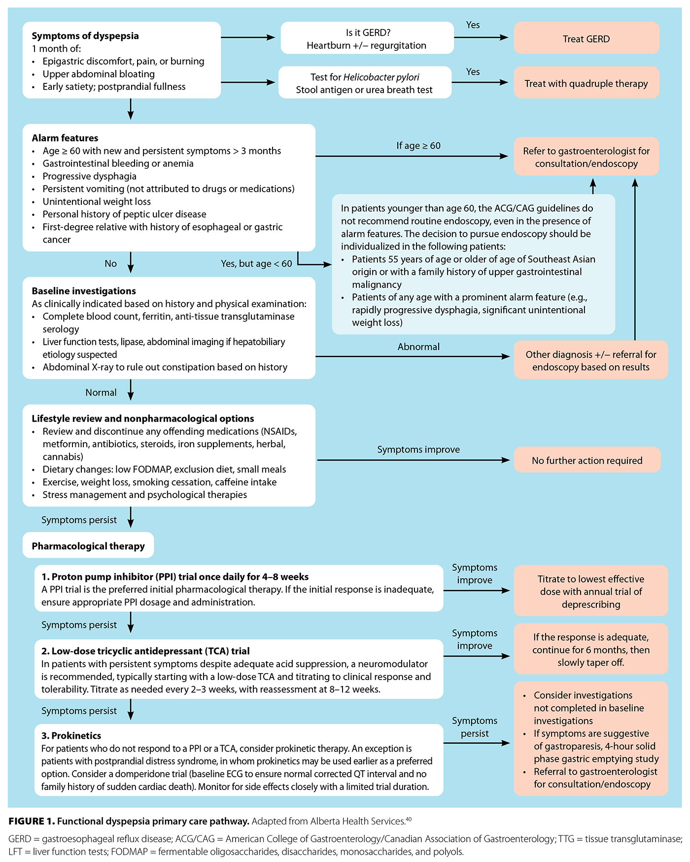 40.    Alberta Health Services. Dyspepsia primary care pathway. Updated 2020. Accessed 17 November 2025. www.albertahealthservices.ca/assets/info/hp/arp/if-hp-arp-dh-dyspepsia-pathway-adult-gi.pdf.