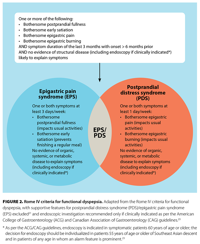 Functional dyspepsia is a chronic, complex constellation of symptoms that include epigastric pain or burning, postprandial fullness, and/or early satiety. Given the spectrum of symptoms, it is a common presenting complaint in primary care; the estimated prevalence is 8% in Canada and 20% globally.[1,2] In addition to its burden on quality of life, functional dyspepsia is associated with significant health care costs: the annual economic impact is estimated at $18 billion in the United States alone.[3] Symptom overlap with other gastrointestinal disorders, such as gastroesophageal reflux disease, gastroparesis, and peptic ulcer disease, leading to misdiagnosis, unnecessary investigations, patient frustration, and significant impact on quality of life.[4] Given that functional dyspepsia affects almost 1 in every 12 Canadians,[1,2] primary care providers are uniquely positioned to diagnose and manage it effectively. Our aim is to provide a structured clinical pathway for diagnosing and managing functional dyspepsia in the primary care setting, which will allow family physicians to build on their expertise to both optimize patient outcomes and eliminate unnecessary wait times and testing.