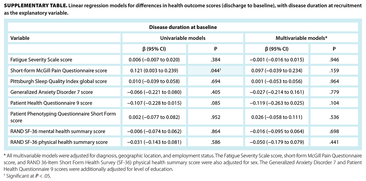 Our findings did not reveal a relationship between disease duration at intake and baseline symptom scores or symptom trajectory between baseline and discharge, except for PSQI scores, where longer disease duration was associated with poorer sleep quality. While symptom improvement is possible over time and with treatment, there are no curative treatments for complex chronic diseases, and prognosis for ME/CFS and fibromyalgia remains poor, particularly beyond the first year of illness.[25-27] Studies have been inconsistent in both methods and results, but generally, longer complex chronic disease duration correlates with poorer health outcomes.[28-30] We may not have seen the impacts of greater disease duration in our study because most participants had long-standing illness (median = 11 years), so early-stage improvements were not observed. Additionally, program enrollment may have excluded those with more favorable early-stage outcomes and those who were most severely affected, which would limit the interpretation of treatment timing effects.