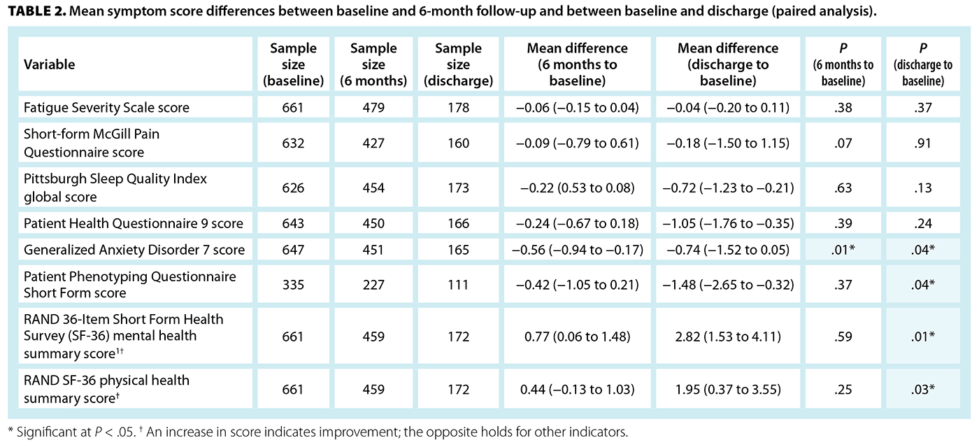 TABLE 2. Mean symptom score differences between baseline and 6-month follow-up and between baseline and discharge (paired analysis).