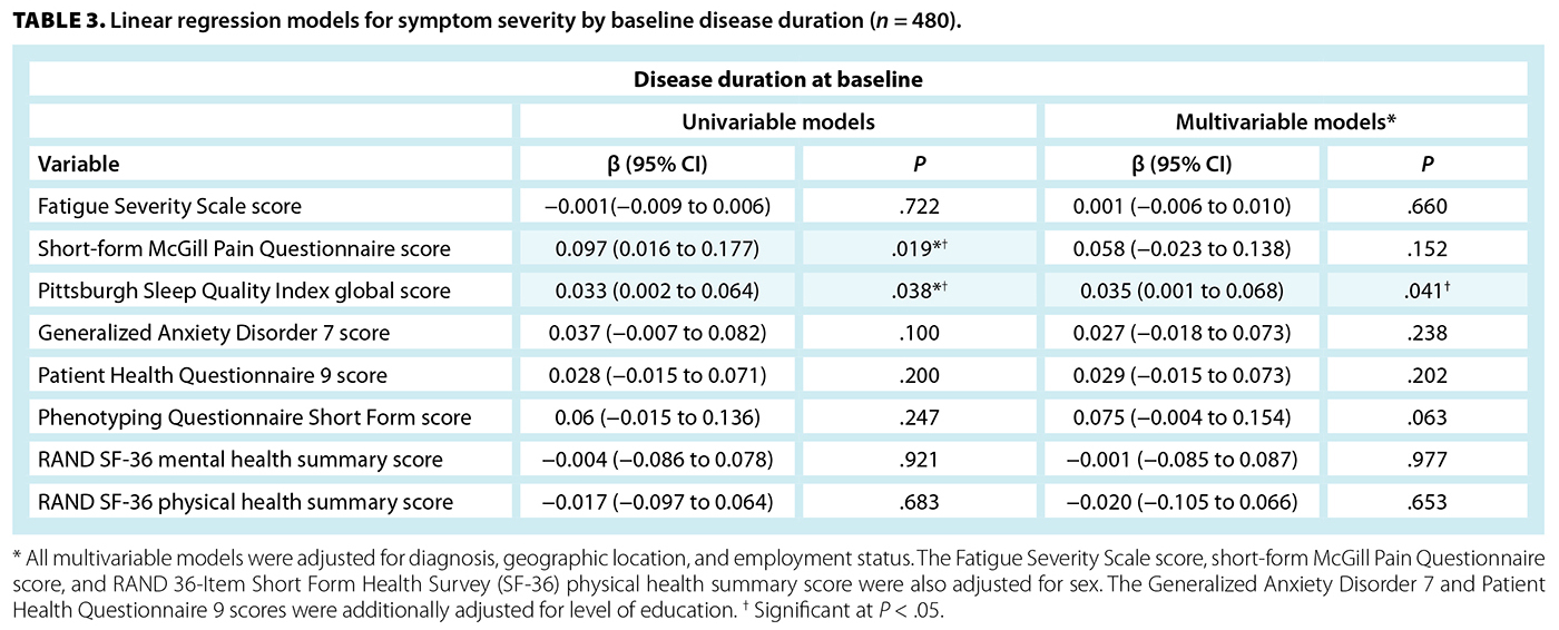TABLE 3. Linear regression models for symptom severity by baseline disease duration (n = 480).