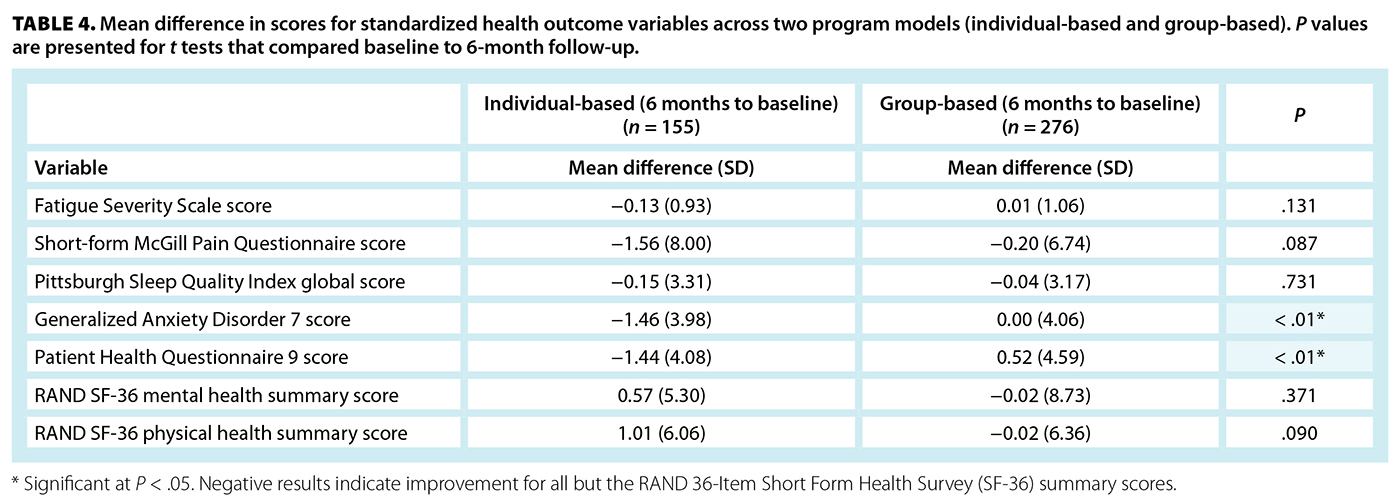 TABLE 4. Mean difference in scores for standardized health outcome variables across two program models (individual-based and group-based). P values are presented for t tests that compared baseline to 6-month follow-up.