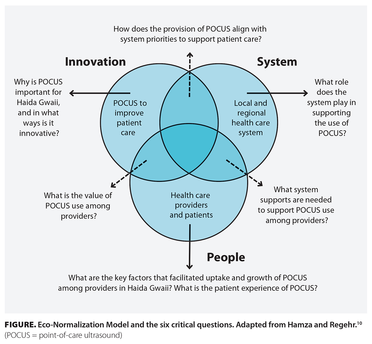 We conducted a retrospective evaluation of the factors that led to the emergence of the innovative use of POCUS on Haida Gwaii. Traditional models of program evaluation were not a good fit, because they were generally prospective and focused on programs that were intentional rather than emergent. The Eco-Normalization Model, a theoretical framework derived from implementation science theories, examines the longevity of an innovation within the context of the local ecosystem and explores features of the ecosystem that may enhance (or detract from) the innovation’s longevity.[10] The model gives rise to six critical questions to consider [Figure]. We contextualized the original model to account for this unique application and expanded the original domain of “people doing the work” to “people involved in the innovation” to include the patient perspective.