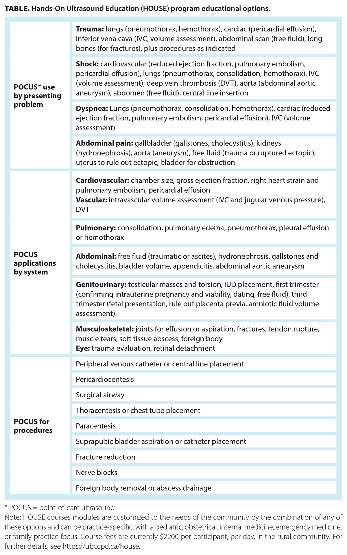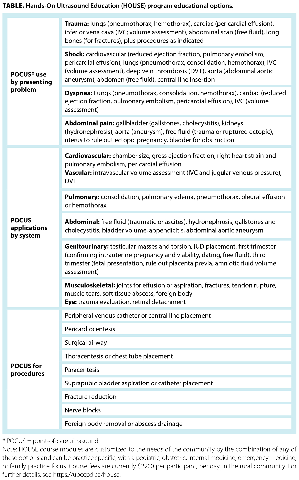 In 2015, recognizing the barriers to acquiring and maintaining proficiency in POCUS, the University of British Columbia’s Rural Continuing Professional Development program, with the support of the Rural Coordination Centre of BC (RCCbc), launched the Hands-On Ultrasound Education (HOUSE) program, an innovative traveling education program on POCUS designed to meet the unique needs of rural physicians in BC.[8] The program was developed with an understanding and appreciation of potato ethics, a “particular rural health care sensibility” described as “an ethics rooted in the duty to make oneself useful … cooperating in the service of whatever is necessary and actively learning whatever is needed to do so.”[9]