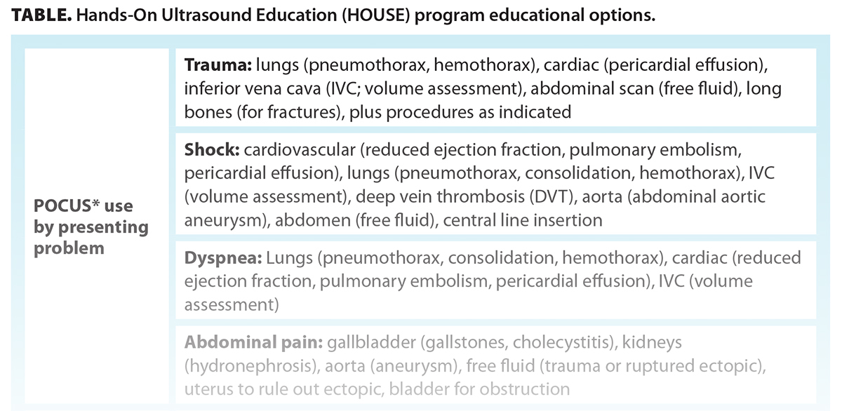 The HOUSE program teaches a wide variety of POCUS applications, and communities customize their learning by creating an agenda from a menu of options [Table]. This can include thematically based learning, such as the multisystem workup of trauma, shock, or dyspnea; specialty-based agendas, such as obstetrics or pediatrics; and agendas based on applications that are not clinically linked, such as exams relevant to the clinic setting (e.g., IUD placement, screening for the presence of an asymptomatic abdominal aortic aneurysm). The course length is determined by the community and can be between half a day and 2 days. Residents and allied health practitioners can be included, at the discretion of the community.