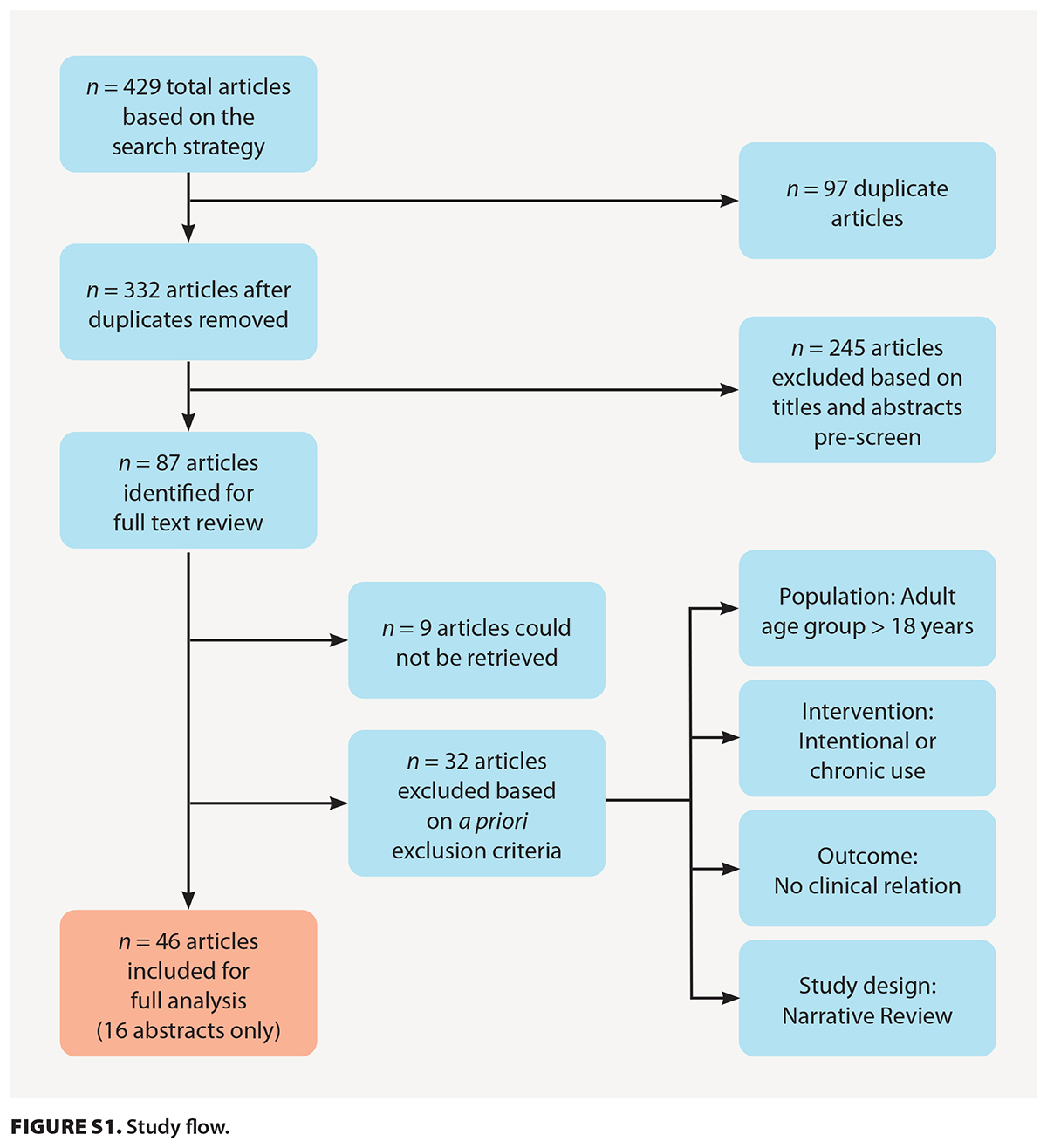 We first screened article titles to remove duplicates, those not written in English, and those that did not discuss the effects of cannabis ingestion in humans. We then obtained the articles we identified for review from the University of British Columbia Library. We removed articles that were not available in the library’s database; referred to an adult-only population or the intentional ingestion of cannabis; did not describe clinical presentation, treatment, or outcome; or were narrative reviews [Figure S1]. We then reviewed the full text of eligible articles and summarized it in relation to our study aim. Table S3 presents a summary of these articles.