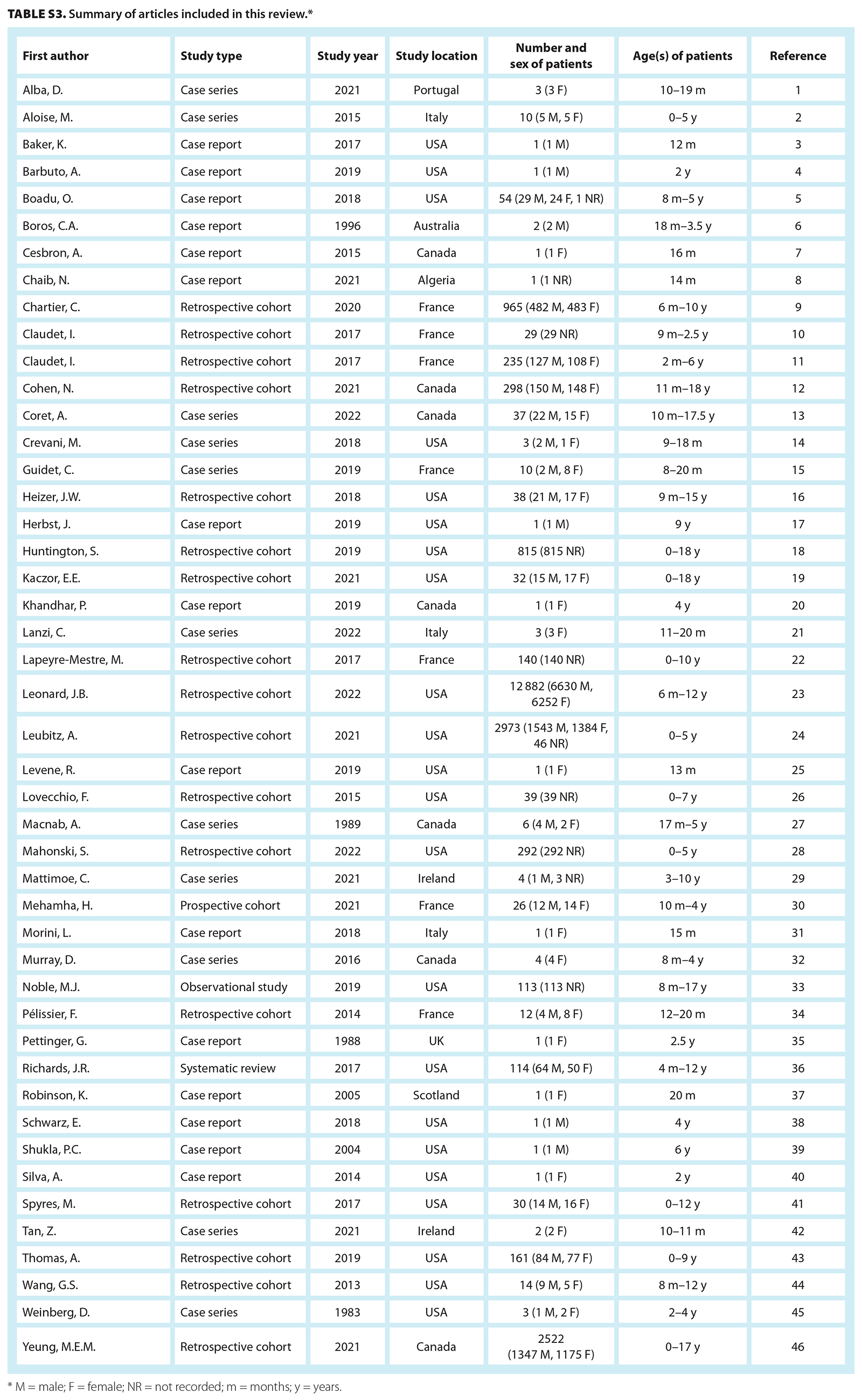 Our search strategy yielded 429 articles. On initial review of titles and abstracts, we removed 97 duplicate articles and another 245 articles based on our exclusion criteria. We reviewed the full text of 87 articles and included 46 of them in our final review, 16 of which were abstracts in press [Figure S1, Table S3]. The included articles were published between 1983 and 2022, six prior to 2012. Most articles were published in the United States (n = 22), followed by Canada (n = 7) and France (n = 7); a small number were published in Italy (n = 3), Ireland (n = 2), Algeria (n = 1), Australia (n = 1), Portugal (n = 1), Scotland (n = 1), and the United Kingdom (n = 1). The studies included retrospective cohort studies (n = 17), case reports (n = 15), case series (n = 11), a systematic review (n = 1), an observational study (n = 1), and a prospective cohort study (n = 1) [Table S3]. The articles summarized clinical presentations, treatments, and/or outcomes for a total of 21 885 patients. Patients’ ages ranged from 2 months to 17 years; 44.9% were born female, 48.3% were born male, and 6.8% did not have their sex documented [Table S3].
