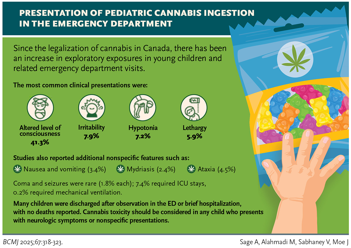 Our review was limited by the quality of the studies included, which retrospectively described clinical presentations, interventions, and short-term sequelae of unintentional cannabis exposure. Given their retrospective and short-term nature, most studies lacked comparisons to other causes of altered consciousness and did not describe long-term outcomes. To ensure a comprehensive review of the literature, we included case series, case reports, and abstracts in press. This introduced a potential bias toward the most symptomatic or severe presentations being included as case reports, which would overestimate the frequency of the symptoms and signs of unintentional cannabis exposure. Further, given the limited availability of published literature, our review included articles from worldwide populations, some of which may not be immediately generalizable to the specific context of Canadian EDs. A review of presentations of cannabis poisonings in the BC Children’s Hospital ED prior to legalization indicated that only 1.1% of poisonings treated at BC Children’s from 2016 to 2018 were related to unintentional cannabis exposure; this highlights the need for ongoing surveillance in BC EDs.[18]