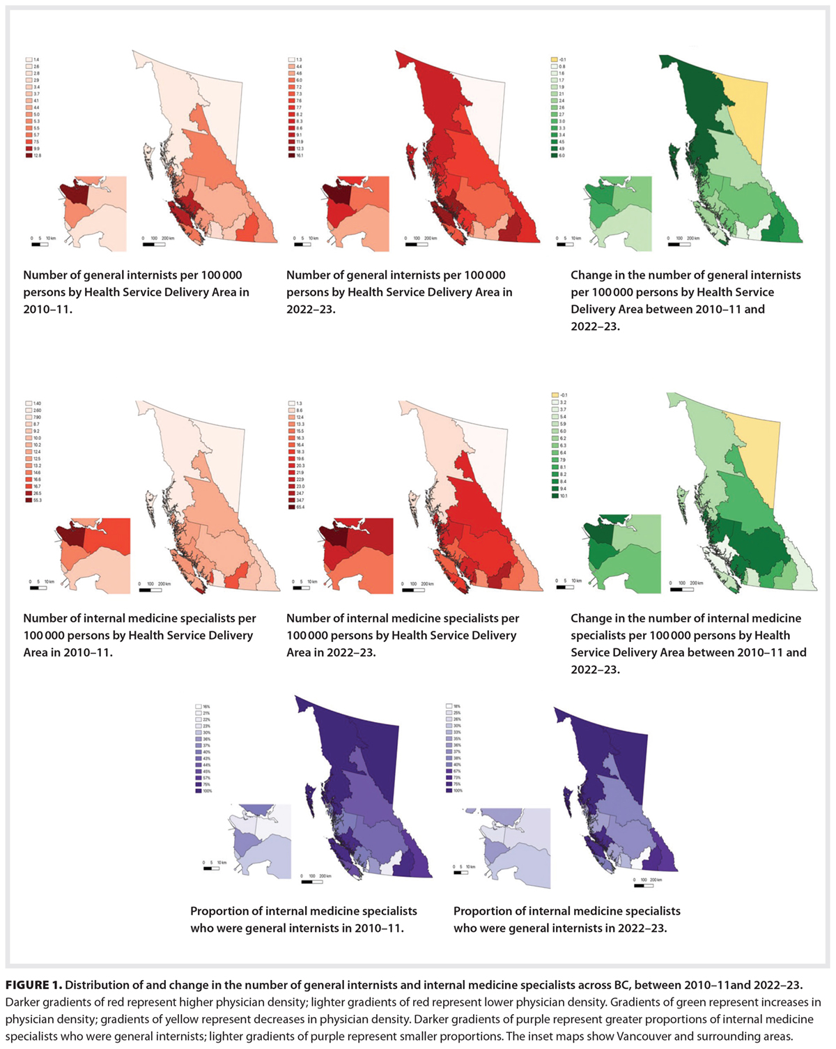 Methods: Clinician data were acquired from BC Ministry of Health Medical Services Plan reports for 2010–11 to 2022–23. The number of internal medicine specialists, pediatricians, and psychiatrists registered in each Health Service Delivery Area was analyzed over time.