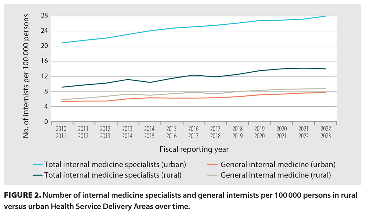 In 2022–23, only 6% to 7% of internal medicine specialists, pediatricians, and psychiatrists were registered in rural and remote areas, straining patients, family physicians, emergency services, and surgical specialties.