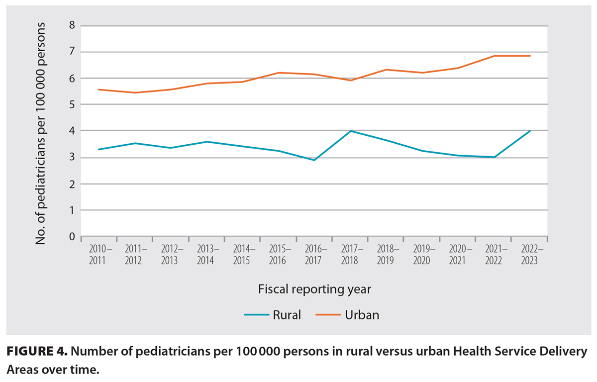 Urban regions had more pediatricians per capita than rural regions, a situation that has persisted since 2010–11 [Supplementary Table 1b]. In 2022–23, Vancouver had 14.6 pediatricians per 100 000 persons, whereas the Northeast region had 1.3 pediatricians per 100 000 persons. The provincial median was 4.3 pediatricians per 100 000 persons.