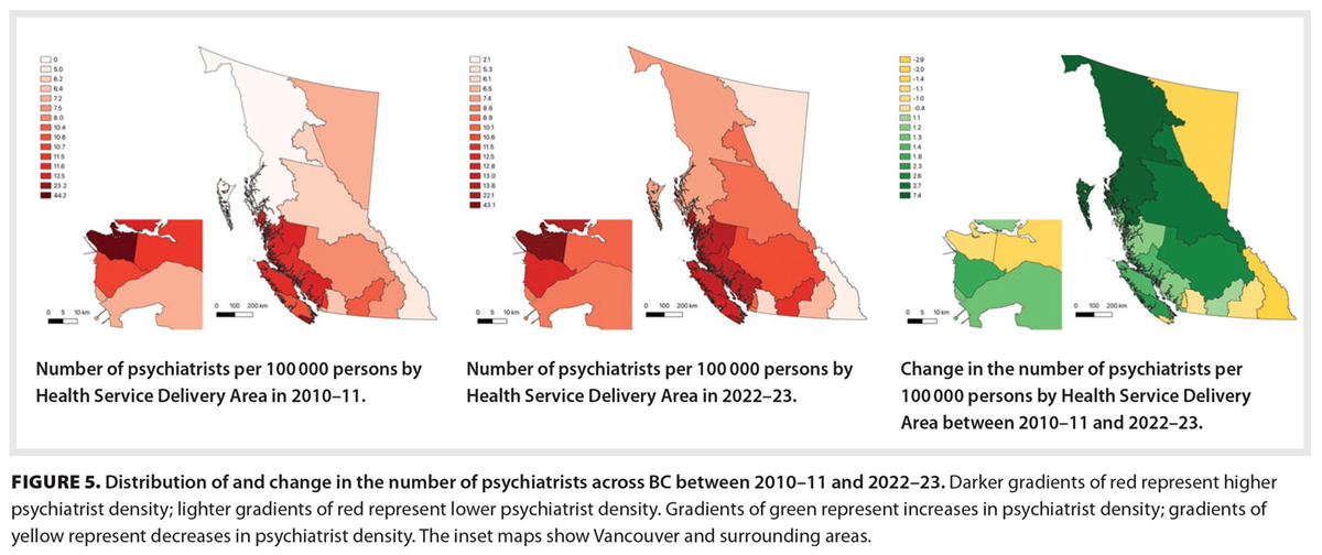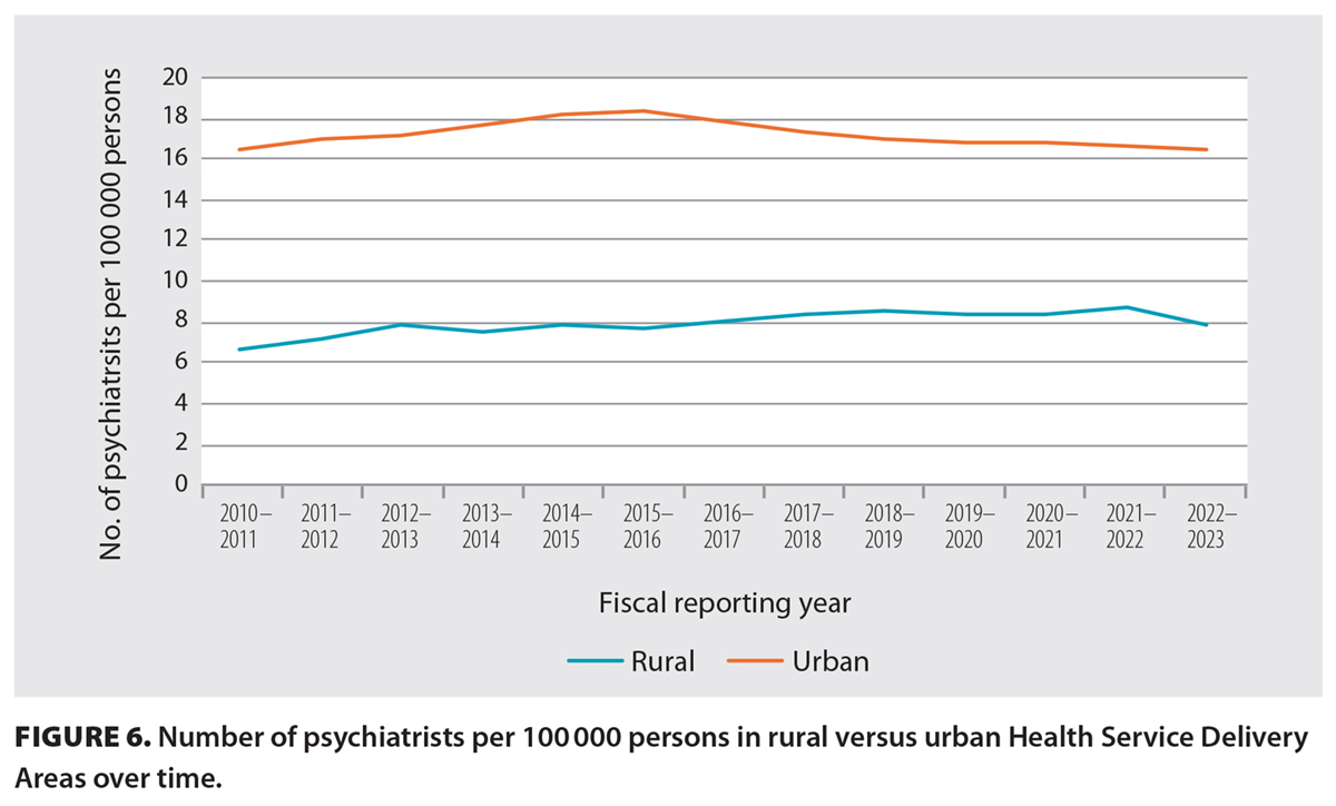 Urban regions had more psychiatrists per capita than rural regions, a situation that has persisted since 2010–11 [Supplementary Table 1c; Figure 5]. In 2022–23, Vancouver had 43.1 psychiatrists per 100 000 persons, whereas the Northeast had 5.3 psychiatrists per 100 000 persons. The provincial median was 10.3 psychiatrists per 100 000 persons.