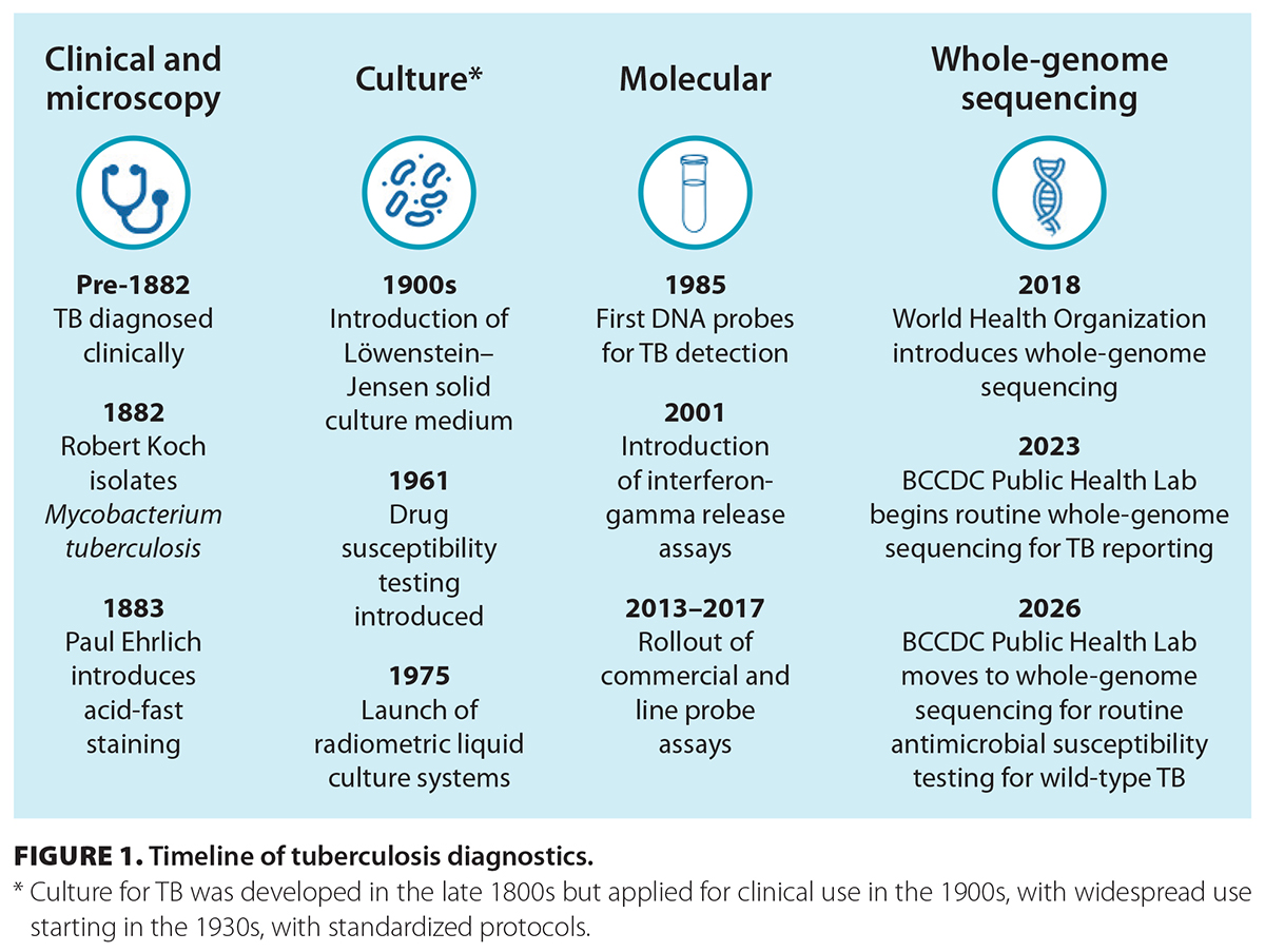 Molecular techniques provide faster and more accurate information about TB, including direct detection and sequencing for epidemiology and susceptibility prediction. This year marks a turning point in TB diagnostics. As of 5 January 2026, most susceptibility testing in British Columbia will rely on genomic prediction rather than phenotypic. This change speeds up the availability of results from 21 days to as few as 7 days following culture positivity.