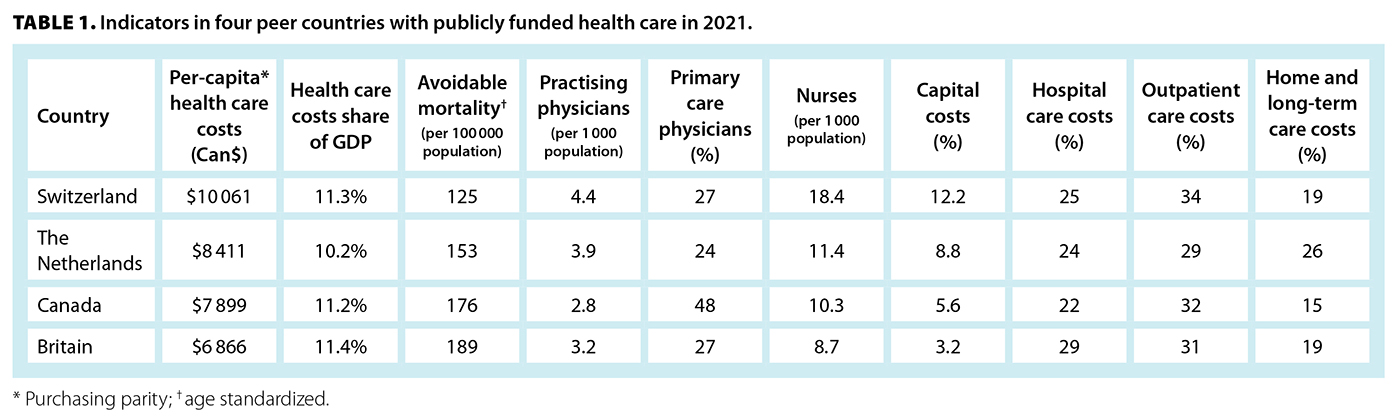 An evaluation of the performance of the publicly funded health care systems of Canada and the Netherlands, after changes to improve access and ensure sustainability, must take into account that the Netherlands is a much smaller country, with the population residing within 15 minutes of their family physician’s practice by car, and no more than half an hour from a hospital and consulting specialist care. The ubiquitous, highly integrated public transport system is also a major advantage for both patients and medical school students, all of whom live within 1 hour of a medical school via public transportation, on which they can travel for free on a student pass. In addition, financial support is readily available for those who need it. These fortuitous conditions were made possible by the discovery of a large natural gas field in the north of the country in 1959, which is now closed.[22] The multiparty elected politicians of the day agreed to use the proceeds to build a capitalist welfare state, focusing on education and training for the future workforce for a planned, modern, technologically sophisticated economy. The Netherlands recognized the importance of the social determinants of health, ensuring adequate future opportunities and support for people with lower incomes, including generous pensions. The long-term effect is that the Netherlands has one of the highest median household incomes in Europe, largely due to its secondary manufacturing and service industries. Its use of a substantial one-time natural resource for the benefit of the country created great social solidarity, including for its publicly funded health care system and its caregivers.[23] Table 1 shows expenditures on the various components of publicly funded health care, published by the Organisation for Economic Co-operation and Development.[2] Included are Switzerland, as the best-performing country, and Britain, as the only other developed country with health care services delivered by the government.