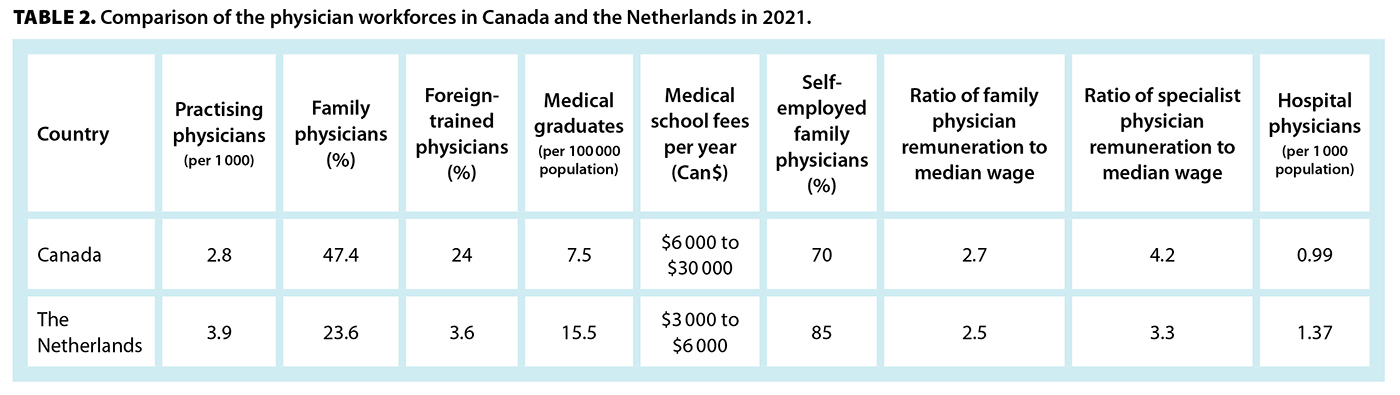 When timely access to medical services began to fail and rising costs became unsustainable, Canada and the Netherlands reacted quite differently. Canada responded with a decrease in physician remuneration combined with maintaining a low physician-to-patient ratio and continued its top-down command-and-control government-operated model. The Netherlands responded with a culture of a common vision of quality and efficiency, using market mechanisms to promote entrepreneurship and competition. By actively engaging physicians to improve efficiency by responding to deficiencies and scarcities of essential needs, they have succeeded in changing the Netherlands’ health care system from its unsustainable state at the start of the century to a well-performing efficient system, producing superior benefits. Primary and specialty care functions are more clearly defined than in Canada, with the Netherlands being an effective gatekeeper. On a positive note, the sorry situation Canada finds itself in may be yet another opportunity for nation building by introducing one uniform comprehensive health care insurance model for all Canadians.