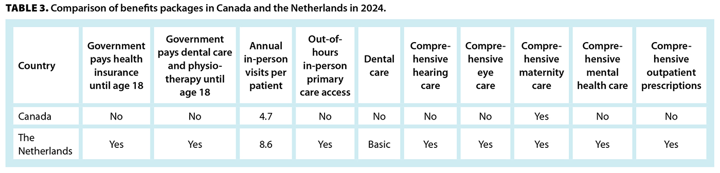 The average number of annual in-person doctor consultations is 4.7 in Canada and nearly double that in the Netherlands, at 8.6. The benefits package in Canada is for “medically necessary services” provided by physicians and hospitals. It is not universally comprehensive, excluding prescription medications and comprehensive eye, hearing, dental, and psychological care [Table 3].[8,12] In the Netherlands, these are included, with full dental care and physiotherapy for children and adolescents up to age 18, and health insurance premiums are paid by the federal government until age 18.[9,13] For young adults pursuing higher education, there are special health subsidies to pay for compulsory health insurance during their education, depending on the individual’s income. Table 3 demonstrates some of the differences in the benefits packages.