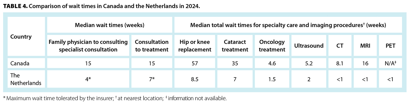 The promptness with which benefits are delivered also varies. Unlike the difficulty in accessing primary care in Canada,[28] in the Netherlands, it is available immediately: 24 hours a day, 7 days a week, 52 weeks a year for urgent care and same-day appointments if deemed necessary by the patient. It is facilitated by the relatively large capitation payment of the blended remuneration formula, freedom for a patient to switch family physicians anytime, and ready availability of family physicians taking new patients. It also makes it attractive for family physicians to locate their practice where there is a need. Access to specialty care is via the family physician and is immediate if needed. Table 4 shows the wait times for specialty care. There are many places to have tests and investigations done, including hospitals. All payments are provided by the patient’s insurer.[13]